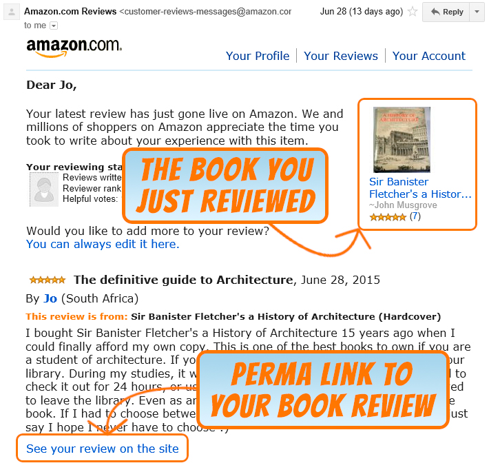 When posting reviews, the procedure is identical. Simply keep a lookout for the email informing you that your review has ‘gone live’ on Amazon. The email should arrive shortly after you submit your review. The permanent link to your review is indicated at the bottom of the message, as shown in the screenshot.